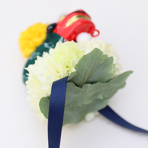 首飾りは、扇をさかさまにしピックの柄の部分を使用してりぼんとしめ縄飾りを巻き留めています。