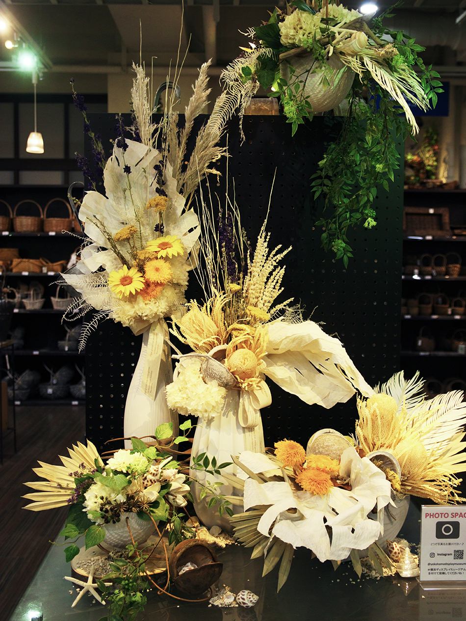 この後も青を基調としたものやヤシの葉など、夏アレンジ・ディスプレイに