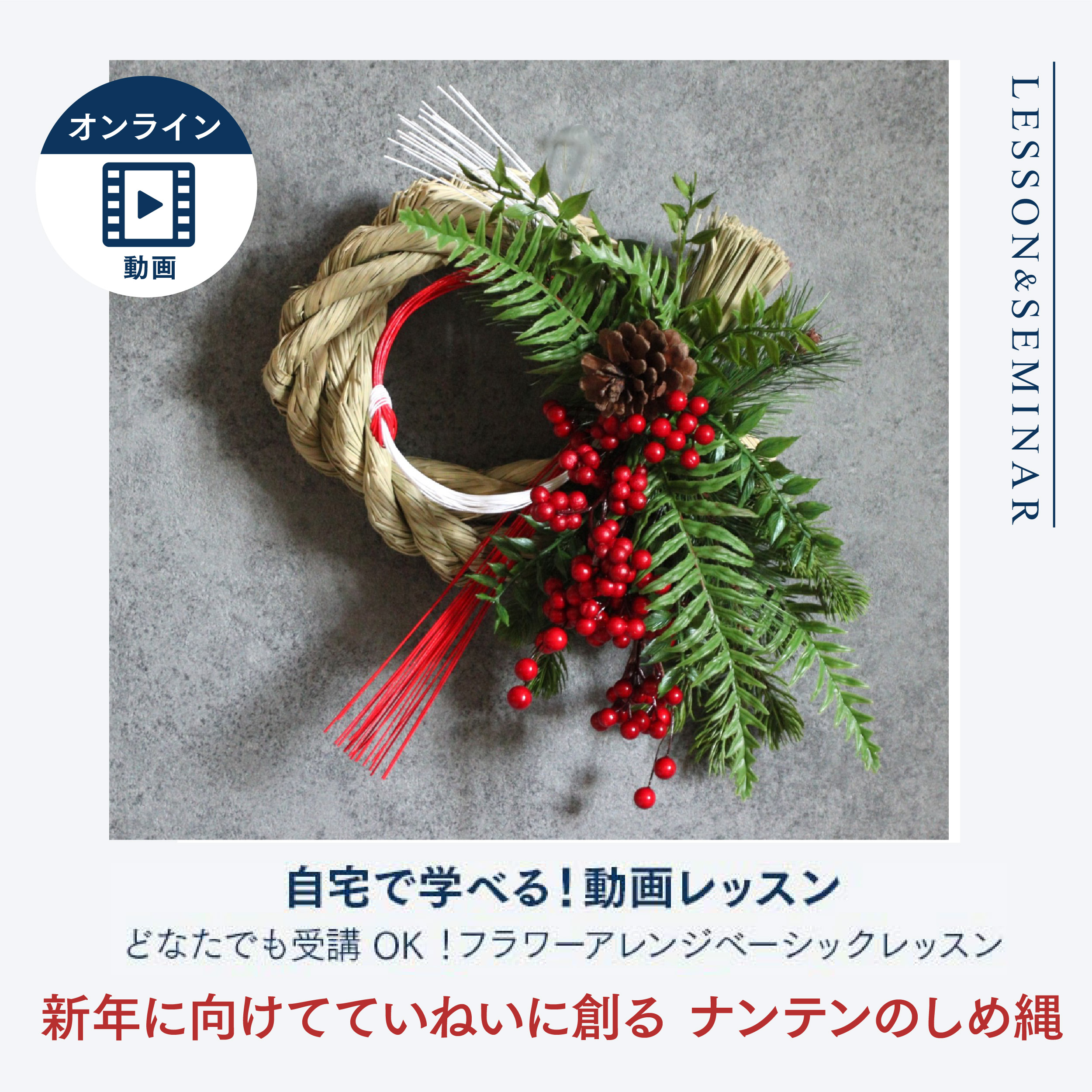 【動画レッスン】赤い実と常緑の葉をたっぷりとまとめた、シンプルで豊かなしめ縄飾り -