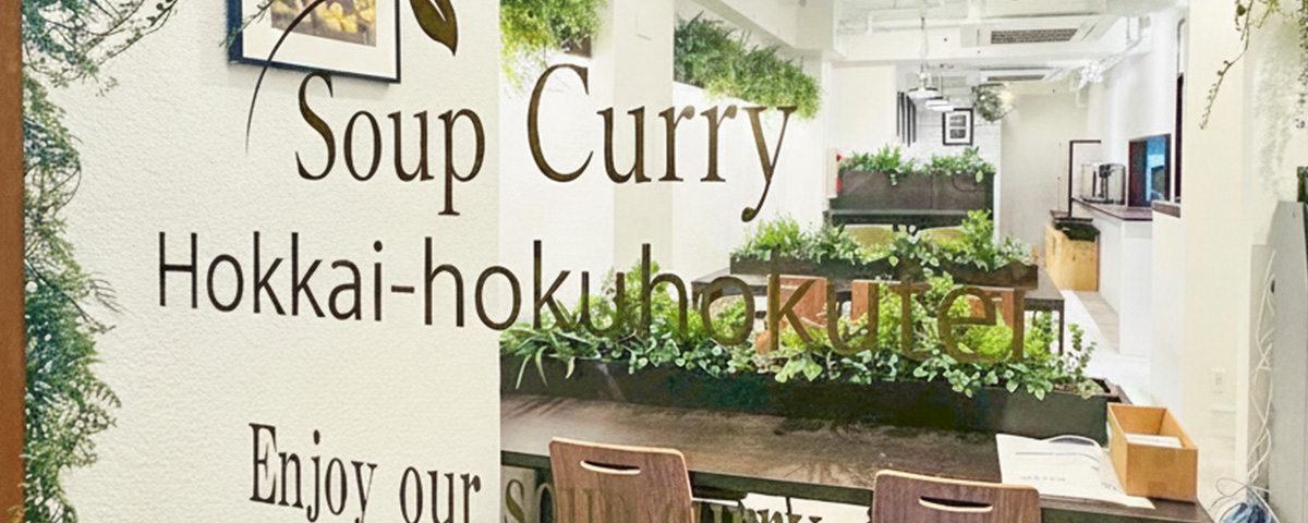 店内に一歩入ると、柔らかなグリーンが迎えてくれる「Soup Curry 北海ほくほく亭 茅場町店」。