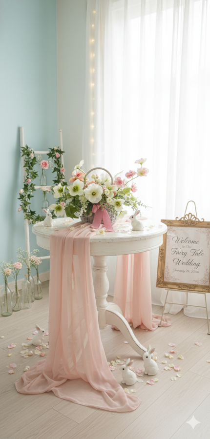 春のウェルカムスペースに|白と淡いピンクのバスケットブーケ(造花)