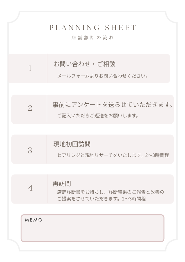 実際に店舗視察をし、売上目標や現状をお聞きした上で報告書を作成させていただきます。
