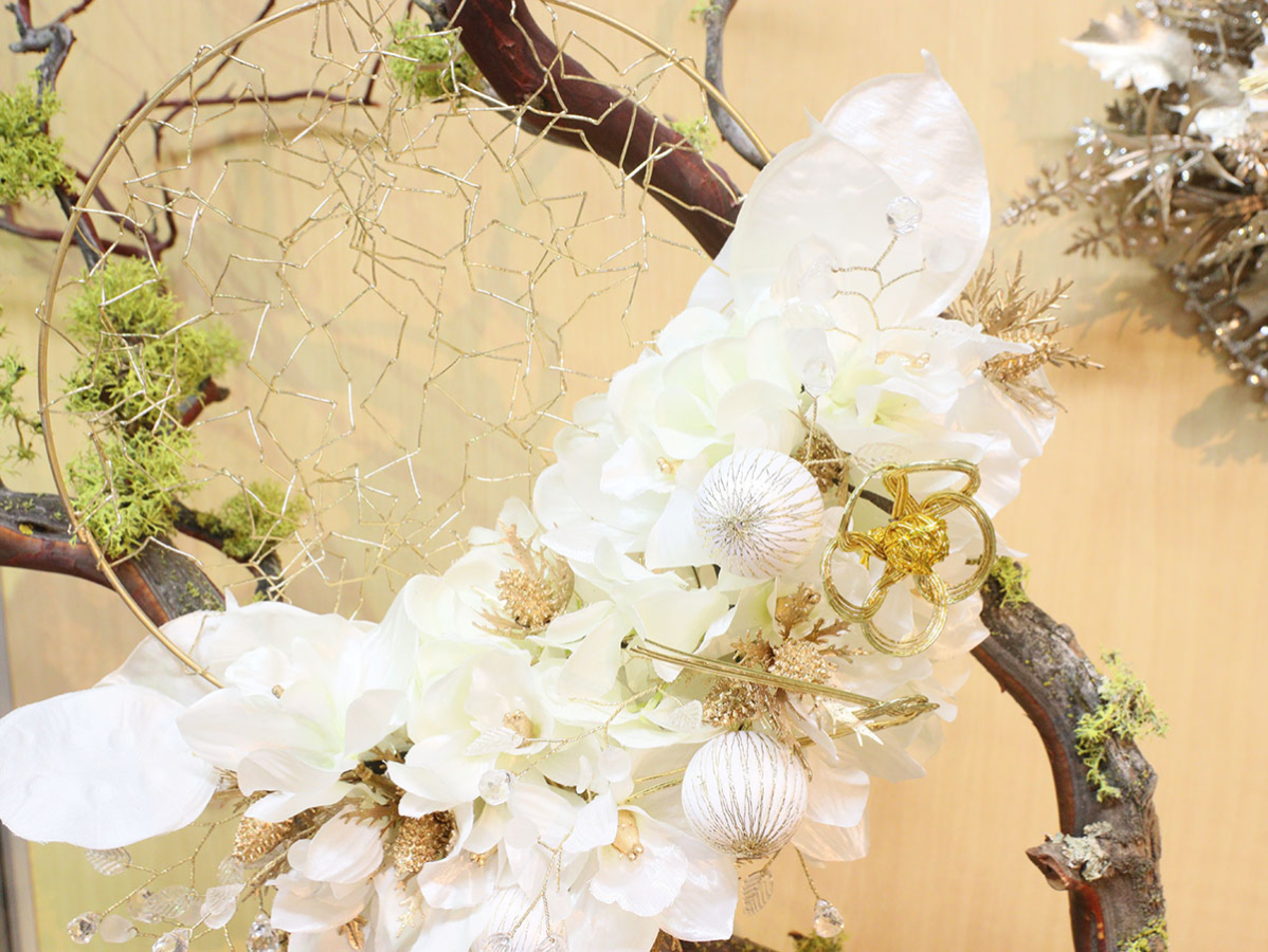 白を基調にした花々に、ゴールドの実物や松かさを合わせた上品なお正月アレンジです。