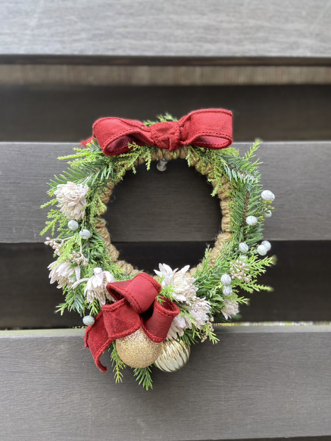ジュートリースにシルクフラワーを巻き付けてグリーンのリースに、