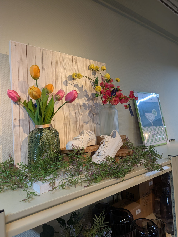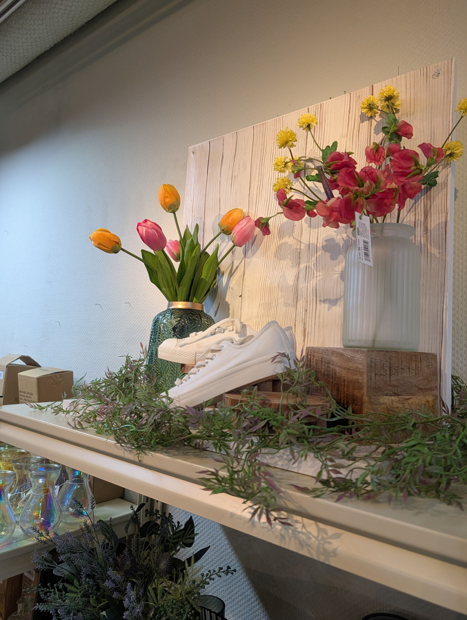 チューリップとスイートピーを使った春の靴屋のディスプレイイメージ