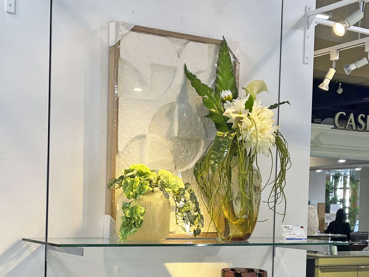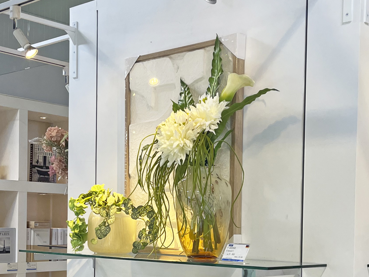 白いダリアとタニワタリを使ったモデルルームのディスプレイイメージ