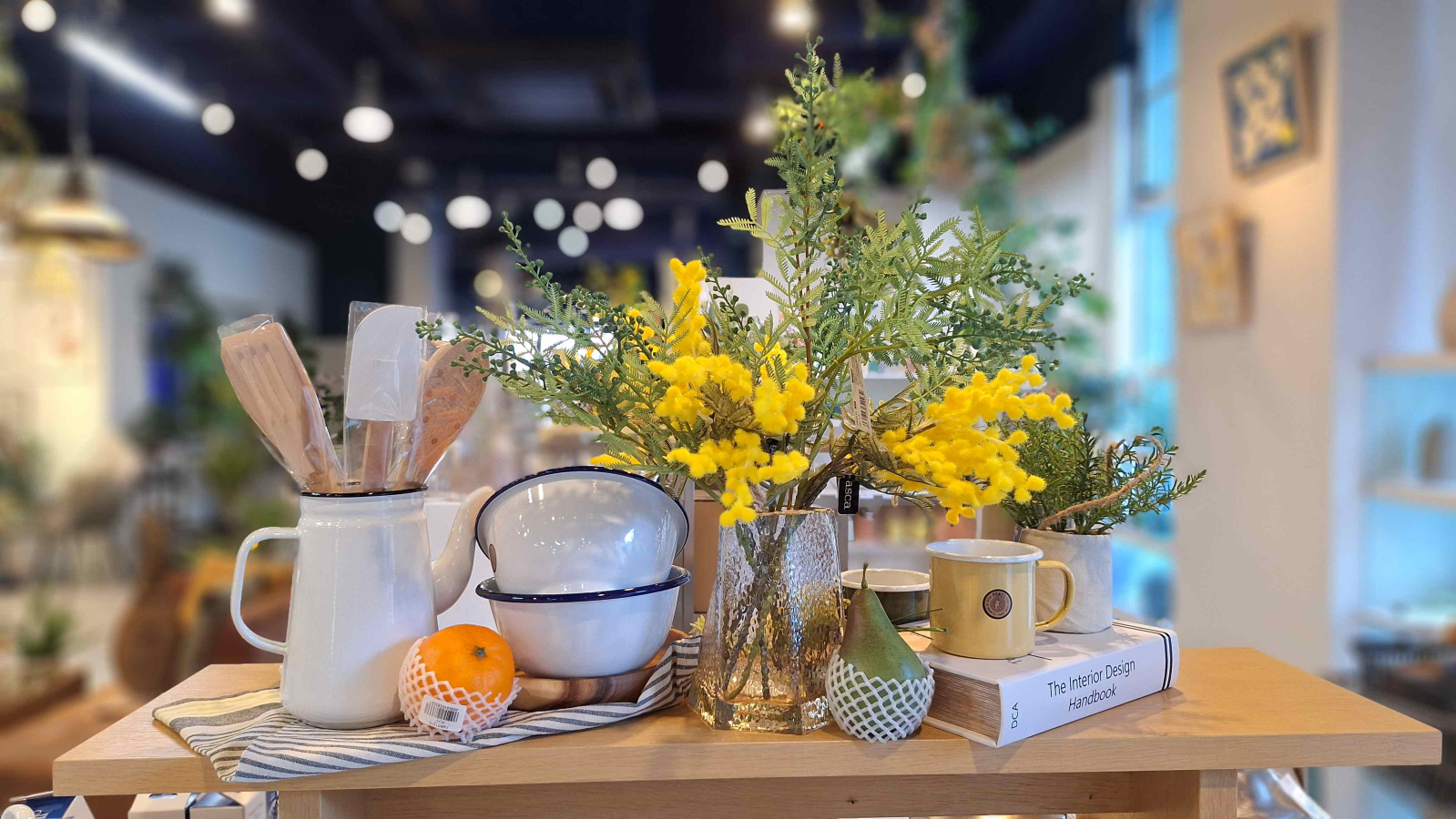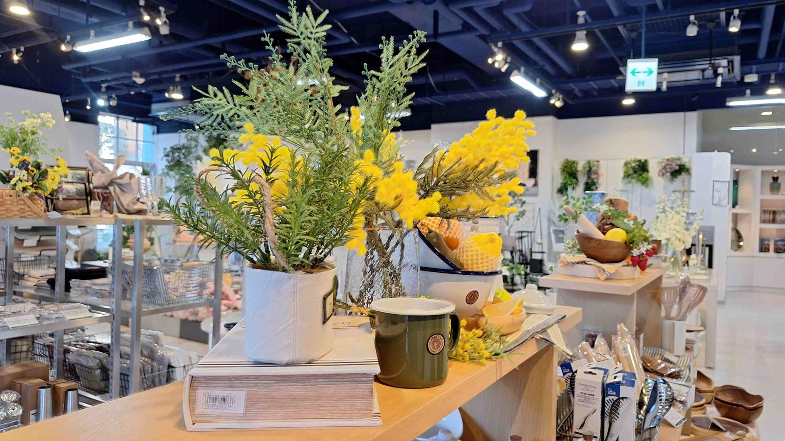 ミモザを使った春のキッチン雑貨店のディスプレイイメージ