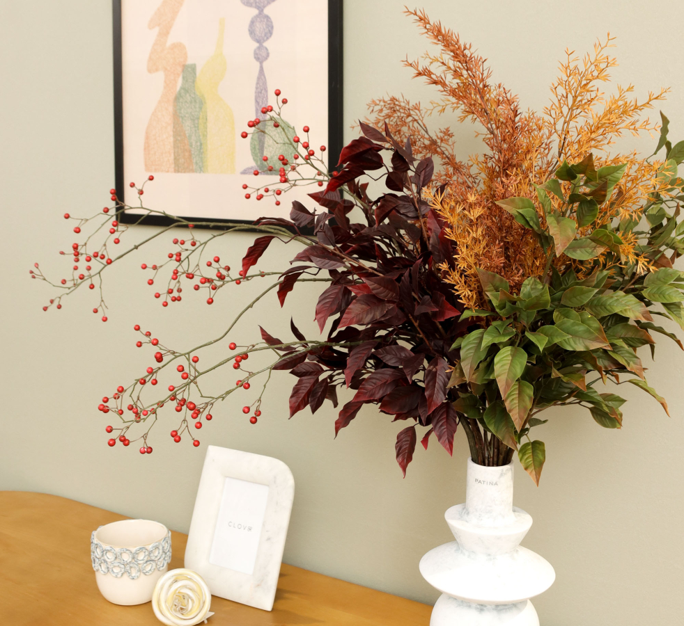 夏から秋まで飾るウォームリーフと色濃いグリーンを使ったコーディネート。 モダンな印象があるので、ミッドセンチュリーなアートフレームを合わせました。