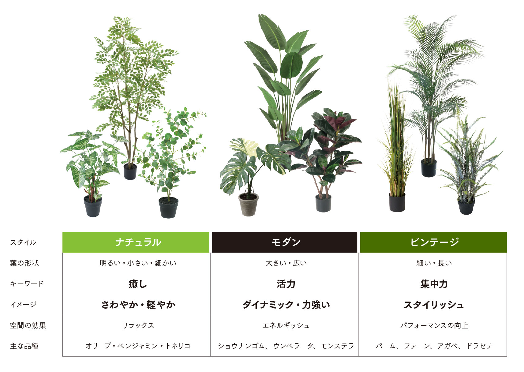 葉の形状によって空間にもたらす様々な効果があります。空間のスタイルに合わせ、ナチュラル、モダン、ビンテージの3つのイメージと主な品種は下記の図のようになります