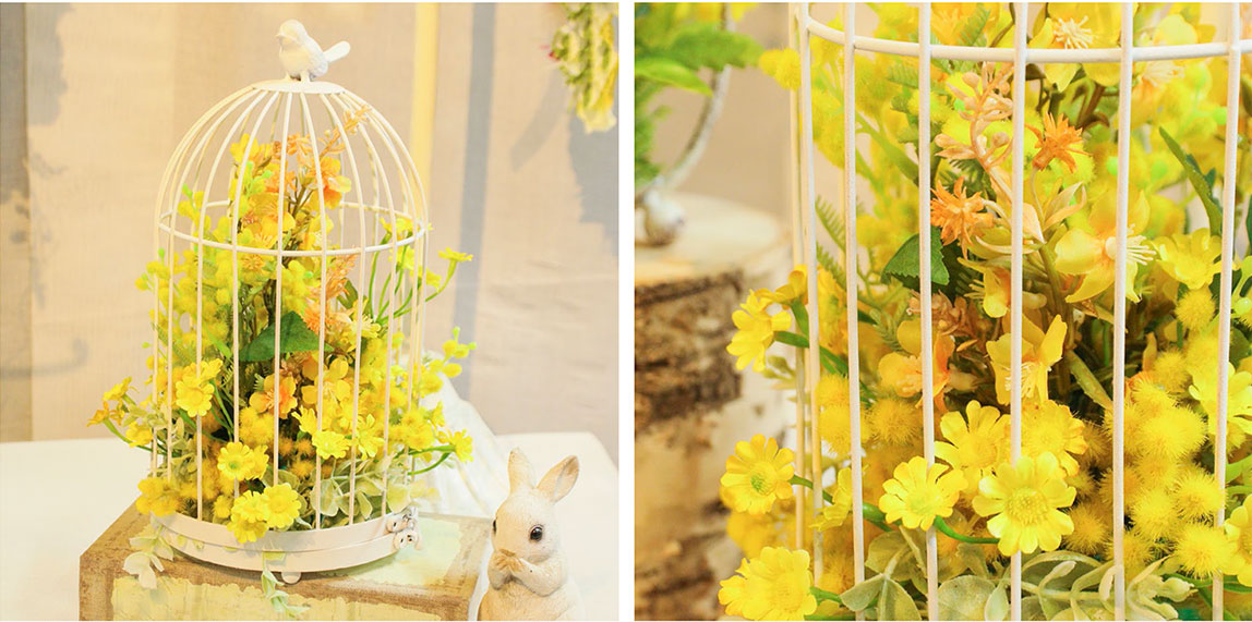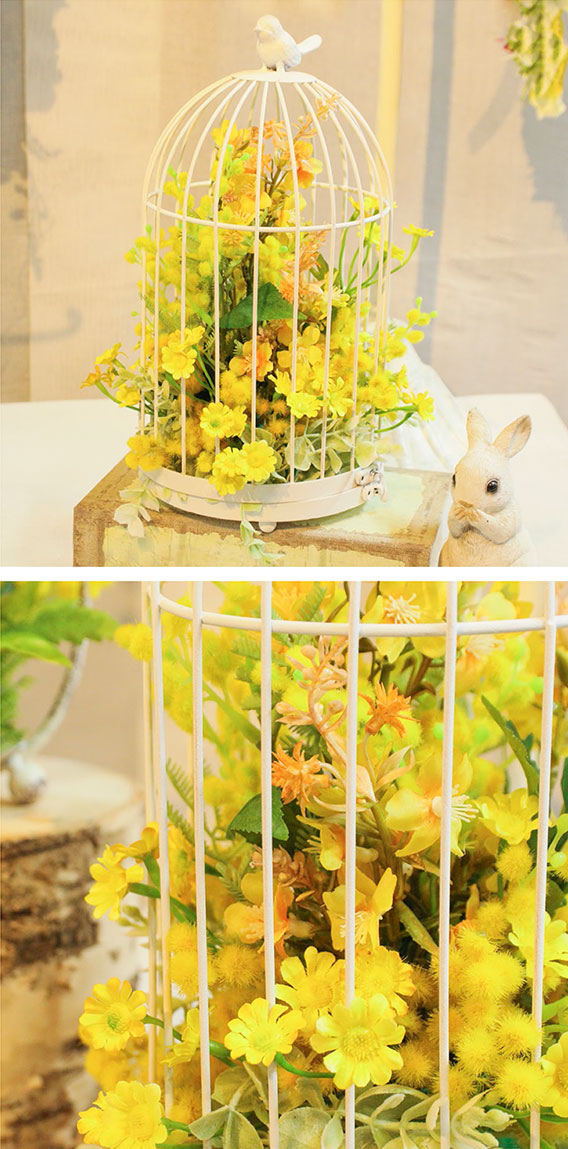 白い鳥かごの中にぎゅっと詰め込んだフラワーアレンジです。