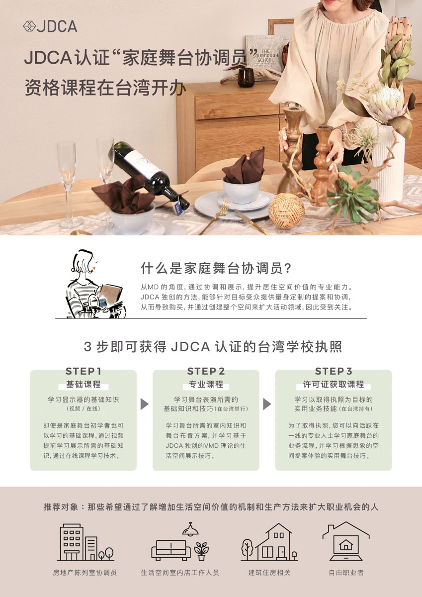 台湾でのカリキュラムは日本同様に、3つのステップで構成されています。 基礎理論を学ぶ【ベーシック】、次にビジュアル・マーチャンダイジング(VMD)の視点で実践テクニックを習得する【スペシャリスト】、そしてホームステージングコーディネーターのライセンス取得を目指す【プロフェッショナル】で、この段階的な学びを通じて、コーディネーターとして即戦力で活躍できる人材を育成します。