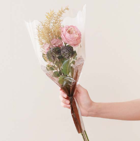 茎を隠せるデザインなので、花束の見た目がすっきり美しく仕上がります。OPP素材を使用しているので、生花にも安心してご使用いただけます。