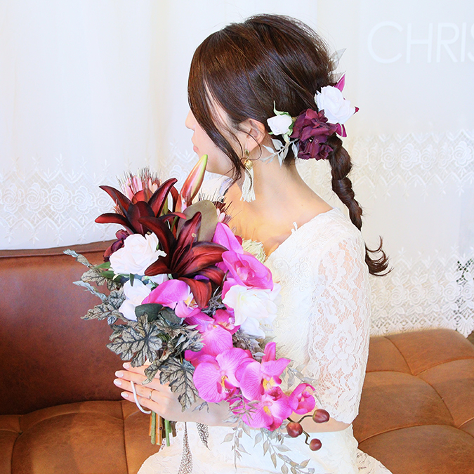 今回は、フラワーアレンジの基本のブーケ、そして髪飾りをご提案いたします。