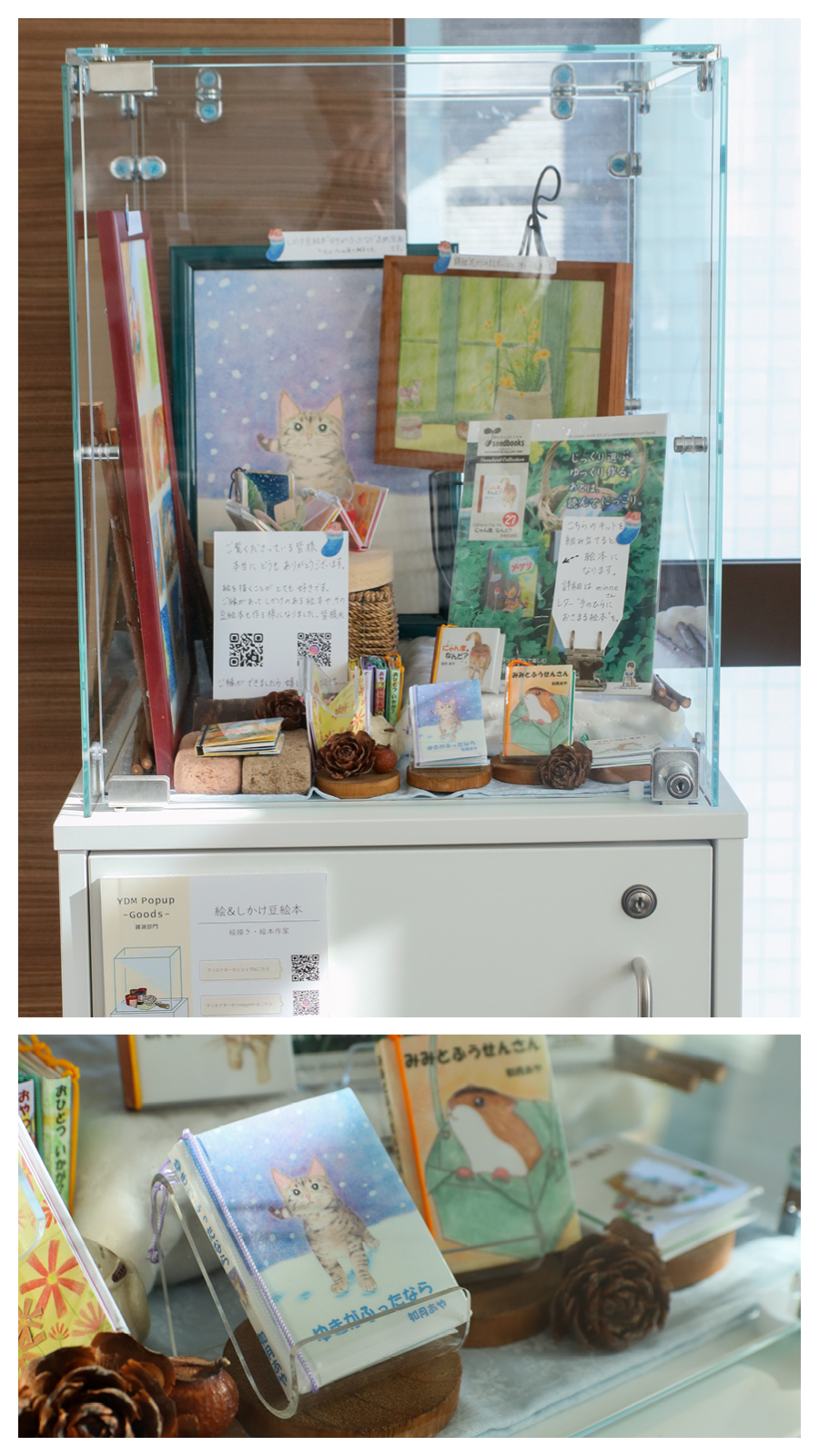 色鉛筆・パステル等で描いたネコや、ハムスター、小鳥たちが登場する小さな額絵・絵本、しかけのある豆絵本などがあります。